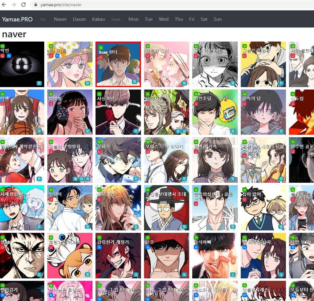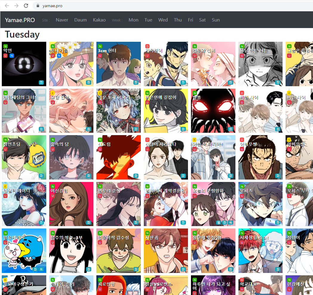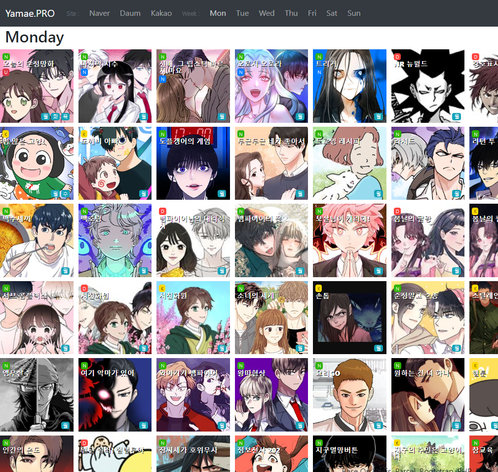 네이버, 다음, 카카오 등의 국내 대표 웹툰을 한눈에 볼 수 있는 사이트 'www.yamae.pro(쉬운 이해를 위해 이하 '야매 프로'로 명칭 하겠습니다.)'의 정보를 드립니다. 야매 프로는 여타 불법 웹툰과 달리 네이버, 다음, 카카오 등 대표 사이트로 단순 링크만 제공하여, 불법적인 사이트가 싫고 심플하게 웹툰만 모아보고 싶다고 생각하시는 분이 사용하시면 좋겠습니다.